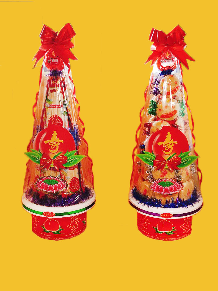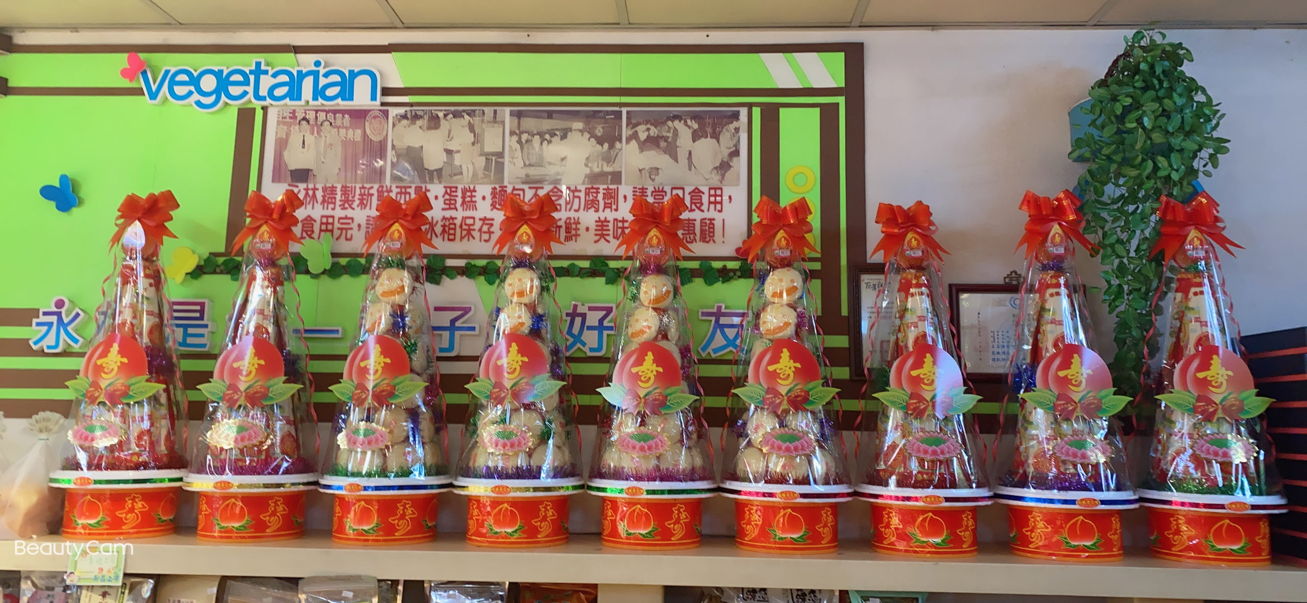 給神明送上最誠意的祝福,二十七顆酥脆又大塊的太陽餅, 從底部向上,緊緊地相黏在一起,十包好吃的壽麵, 一路向上,頂部還有兩顆壽桃形狀的甜滋滋果凍,絕對誠意十足!!!